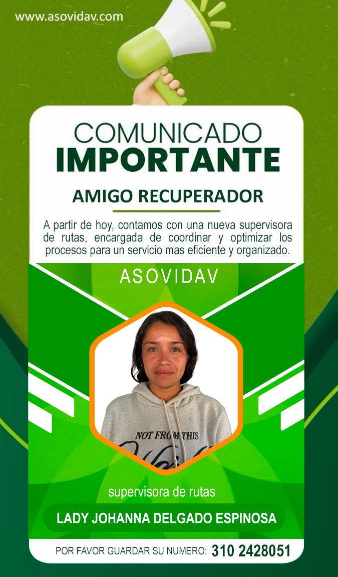 ASOVIDAV informa que contamos con una nueva supervisora de rutas, Lady Johanna Delgado Espinosa quien se integra a nuestro equipo con el objetivo de fortalecer la organización, el seguimiento y la mejora continua de las rutas, reafirmando nuestro compromiso con un servicio eficiente y de calidad para la comunidad.